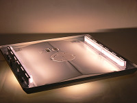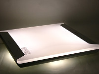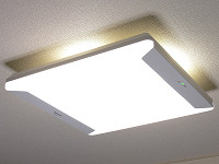 | 本体をほぼ真横から見る。LEDシーリングライトは薄いものが多いが、本製品は意外と分厚い。これは「間接光」専用のLEDユニットがあるためだ | 発光面はLEDにありがちなツブツブ感がなく、肉眼ではほとんど光ムラは気にならない。全面発光が実現していると言って良いだろう |