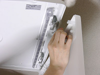 | 【4】アダプター用ふたを取り付け、本体とアダプターの接合部をカバーする | 【5】ここでカバーを本体に取り付ける。カバーについているバネをつまんで、本体の金具に一カ所ずつひっかける | 【6】その後、バネを金具に取り付ければ、手を離しても大丈夫。バネは万が一の落下防止にもなっている |