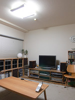 | 「普段のあかり」で、光色は「白い色」・明るさ100%時の様子。画面のテーブル上の明るさは410lxを超えた(光源からの距離は約2m)。天井付近も含め、部屋全体が隅々まで明るい | こちらはこれまで我が家で使っていた、消費電力が95Wの蛍光灯シーリングライト。テーブル面の明るさは300lx弱だった |