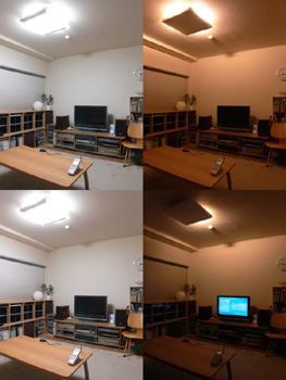 | (左上から時計回りで)普段のあかり、くつろぎのあかり、シアターのあかり、勉強のあかりとなる。光色や明るさ、配光はボタンを押すだけで簡単に切り替えられる |