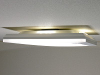 一方、器具の裏側(天井側)には、独立した「間接光」専用のLEDユニットが4つある。こちらは天井付近を照らし、天井からの柔らかな反射光を作り出すものだ。LEDチップは直接見えないが、やはり白色と電球色のLEDが並べてあるようだ。天井に取り付けられている状態だと、奥まったところにあるため直接目に触れにくい。