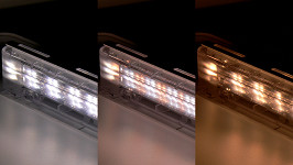 | カバーをはずしたところ。本体内部には2本のLEDユニットが向かい合うように配置されている。器具内で反射した光がカバーを通って、器具の下方を明るく、柔らかく照らすというわけだ | LEDユニットには、白色と電球色のLEDチップが交互に配置されている。左から白色、混色、電球色の場合 |