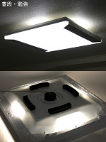 準備が終わり、まず「普段モード・白色・明るさ100%」で点灯してみたところ、とても明るい。それまで使っていた蛍光灯のシーリングライト(消費電力は95W)は、光源から真下約2mの明るさは300lx弱だったのに対し、本製品は414lxと、はっきりと差が感じられるほど明るい。消費電力については次回で詳しく述べるが、この時は83Wと、蛍光灯より10W以上も低かったのだ。