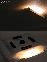 取り付けの際に考慮する点は、この器具は「シアターのあかり」という、テレビで映画を見るためのモードがあるので、センサー部をテレビに向けて設置する必要がある。テレビが無いならば、取り付け方向は自由だ。