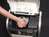 ガスの向きをフタ裏のシールにしたがってセット。あとはレバーを奥に押し込むだけでOK。もしガスの向きが違っていたりすると、レバーを置くまで押し込めないようなセーフティー機能もあるので安心だ。