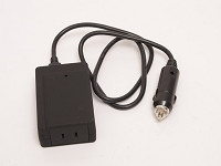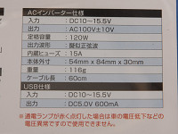| 実験に使ったDC→ACインバータ。車のシガーソケットから100V、120Wまでの電源が取れるのでキャンプなどでは便利 | パッケージを見てみると、交流100±10Vが出力され、120Wまで取れると書いてある。波形には、擬似正弦波とあるが、Hzまでは書かれていない |