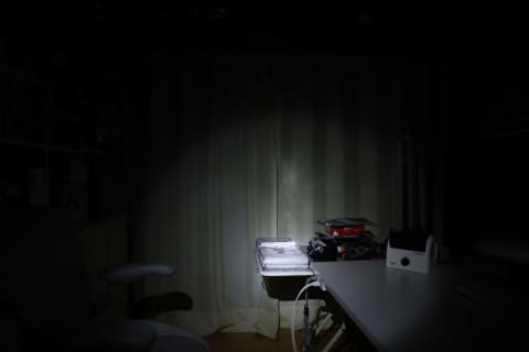 ムサシの「充電式マルチLEDライト6W小型(COB-WL001)」は、サイズ61×45×20mmで重量約45gのLEDライト。6WのLED(COB)を採用し、最大500ルーメンで照らします 小技がイロイロと効いていて、たとえば底面には三脚ネジ穴があります 背面の脚を開けば自立します。左サイドに電源ボタンがあります 充電用のUSB-Cポートは右サイド。上部にはカラビナがありつつ、その左には栓抜きがあります 以降、明るさ比べをしていきますが、「充電式マルチLEDライト6W小型(COB-WL001)」との比較対象はLED式のマグライトです。夜道を歩くには十分の明るさがある製品です 筆者の仕事場の照明をすべて消した状態です。機器のLEDライトがかすかに見えます。ほぼ真っ暗。なお、カメラは露出を固定してあり、以降の写真はすべて同じISO/絞り値/シャッター速度です そこをマグライトで照らしました。写真ではあまり明るくないように見えますが、マグライトで照らしたら十分動き回れる明るさになりました 「充電式マルチLEDライト6W小型(COB-WL001)」を机上に上向きに置いた様子。このライトはボタンを押すごとに「中」→「弱」→「フラッシュ」と明るさなどが変わりますが。これは「中」の明るさです。感覚的には「これなら停電になっても大丈夫だ」という明るさ 今度はライトを手に持って前方を照らしました。明るい! これも「中」の明るさです さらにボタンを長押しにして「強」の明るさにしてみました。500ルーメンの光束だそうですが、非常に明るいです こちらは別の部屋。常夜灯のみが点いている状態です。これでも肉眼なら「どこが床か」程度が見える明るさです そこをマグライトで照らすと、こんな明るさ。これなら十分行動できます 「充電式マルチLEDライト6W小型(COB-WL001)」を机上に上向きで置いた様子。「中」の明るさで、危険をしっかり避けて行動できるというレベルの明るさです 「中」の明るさでライトを手に持って正面を照らした様子。明るいです ボタンを長押しして「強」の明るさに。昼間の部屋っぽい明るさです いや~すごい明るさ。ちなみに、連続点灯時間は、「強」で1時間、「中」で1.5時間、「弱」で3.5時間、フラッシュだと3時間となっています。オープン価格ですが、1,800円前後で売られていることが多いようです。