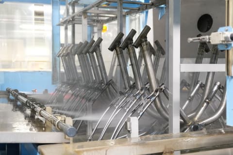 フレームの汚れを落とし、キレイに塗装するための準備が「皮膜処理工程」。湯洗いで油分を除去し脱脂。水洗い後、酸洗いでリン酸反応を促進。その後も皮膜化成のために複数回の水洗いを行ない乾燥炉へ。実に10回以上の工程が行なわれます。
