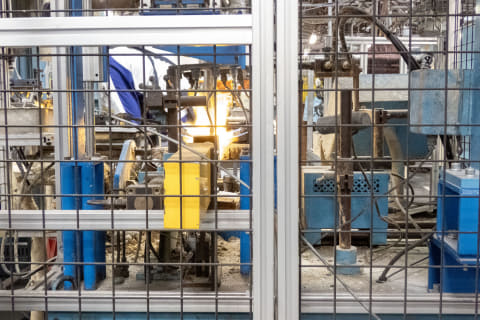 溶接では、部品間にろう材を流し込み内側から溶接する「ろう付」、溶接棒を電極とする熱を発生させて母材と溶接棒を溶かして結合する「MAG」、タングステンを電極とする熱を発生させて母材と溶加材を溶かして結合する「TIG」の3工程。MAG溶接では自動ロボットが効率良く生産していきます。