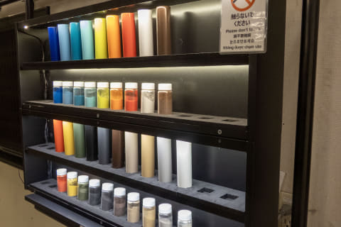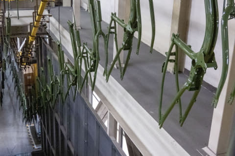 高品質な下地が形成されると、いよいよフレームの塗装へ。ここでもロボットが大活躍。フレームの入り組んだ箇所に補正塗装を行ない、その後全体に一気に吹き付ける作業へ。そして、焼き付けと乾燥を終えるとキレイなフレームが誕生します。カラーごとに塗装作業が行なわれ、塗装の際に飛び散ってしまう塗料も再利用しているとのこと。ちなみに塗料のラインナップも豊富。