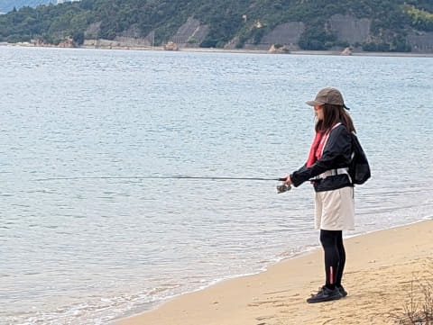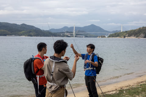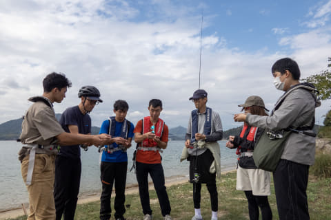 自転車は慣れていても釣りは初。シマノスクエアと上島町のイベントスタッフの丁寧なレクチャーを受けている参加者はちょっと緊張気味!?