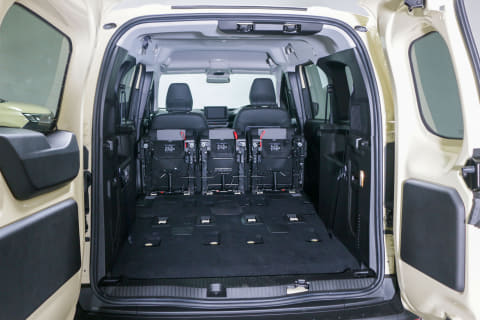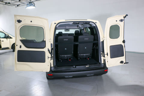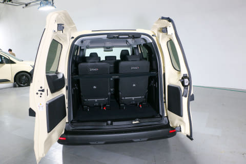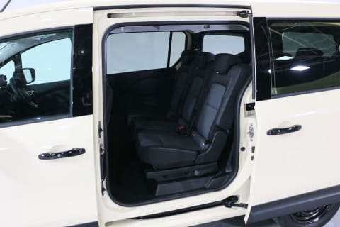 ロングボディ化に合わせてスライドドアの開口部も大きくなっています。開口幅は830mmでノーマルの「カングー」に比べて180mmの拡大。2列目・3列目のシートへのアクセスがかなりしやすい印象でした。ラゲッジスペースにアクセスするバックドアは「カングー」の特徴でもある観音開きのダブルバックドアは採用。本国仕様の「グランカングー」はハッチバックドアなのを日本導入に当たってダブルバックドア仕様としたとのこと。バックドアを開ける際に必要となるスペースが少ないというメリットもあります。
