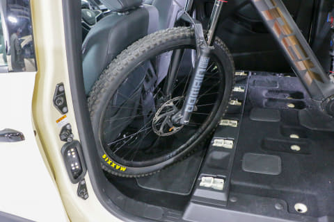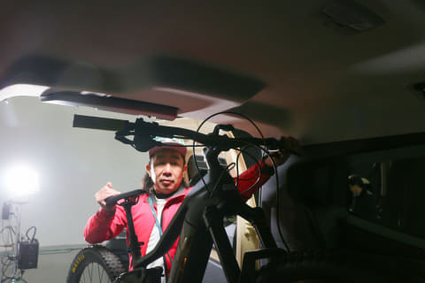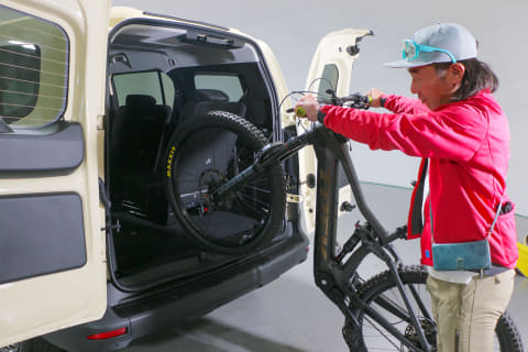 実際にe-bikeを積み込んでみると、このバックドアの開口面積の広さと床面の低さはとてもありがたいものでした。我々は数多くのクルマにe-bikeを積んできていますが、重量のあるフルサスe-MTBはフロントタイヤを持ち上げるのに結構力を使います。「グランカングー」のラゲッジスペースの床面は594mmとかなり低くなっているので、持ち上げる高さが低くてだいぶ楽です。