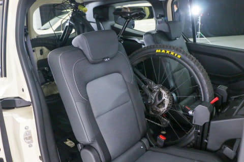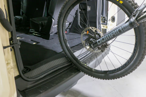 2列目のシートをすべてたためば、さらに余裕を持って積めます。ホイールが大きい29インチのe-MTBが積めるので、ほとんどのe-bikeは問題ないと考えていいでしょう。この状態で、26インチタイヤの自転車も積んでみましたが、かなり余裕があったので自転車を積むだけなら4台くらいはいけそうです。