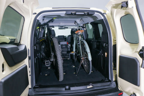 これまで多くのクルマにe-bikeを積んで出かけてきましたが、大柄なe-MTBを2~3台積んでライダーも乗って……となると、ハイエースかキャラバンに選択肢が限られていました。そこに登場した「グランカングー」は我々にとって黒船的な存在。