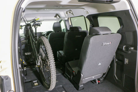 トランポとしての活用を考えると、2・3列目のシートを取り外せる点が注目です。工具を使わずに脱着が可能なので、普段は装着しておいて自転車を積むときだけ取り外すという使い方も苦にならなそう。積み込むのが1台だけなら、左側のシートだけを取り外すことで対応できるのもメリットです。