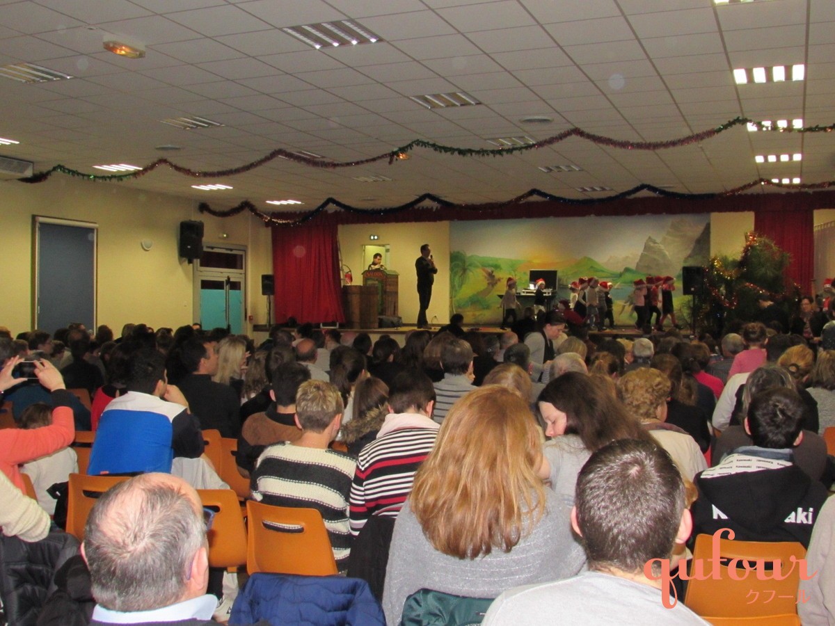 フランスでは、幼稚園といえども、発表会やお遊戯会は、保護者のため夕方遅くや夜から始まることが多く、金曜日や土曜日の夜が一般的です。夜の開催でも、下に小さい子どもがいる家庭では、赤ちゃんを連れて見に来る人が多くいます。平日の昼間に発表会が行なわれることはなく、また週末の夜なので、ダラダラとお酒を飲みながら、周囲のママやパパとおしゃべりし、我が子の晴れ姿を堪能します。