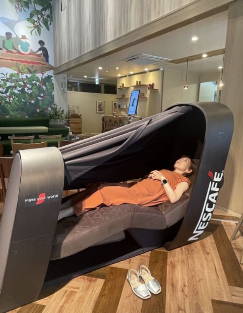 2017年以降のイベント開催などを経て、2021年3月から「ネスカフェ原宿」3階に「ネスカフェ 睡眠カフェin原宿」をオープンしているネスレ日本が、コーヒーナップの認知を高めるために、トヨタが開発した戦略的仮眠ツール「TOTONE」とコラボ。コーヒーを飲んでから「TOTONE」で仮眠をとる体験時間は30分。筆者も「TOTONE」で横になる体験をしましたが、これがなかなか心地よく、うっかり本当に眠ってしまいそうになりました。