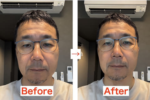 さて、効果についてですが、明らかに顔の下半分が軽くなっています。力を込めなくても筋肉がスムーズに動き、自然な笑顔を作りやすい。口も大きく開けられるし、目もパッと自然に大きく開けることができます。自分は軽い顎関節症なのですが、なめらかに口が開けられることには驚きました。