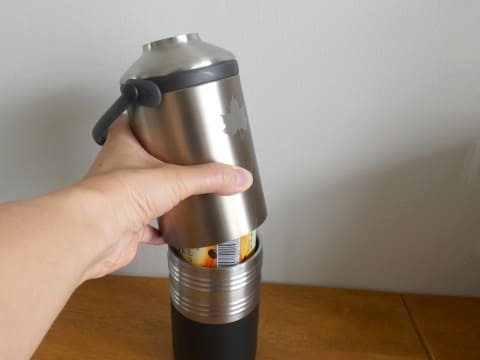 本体は上部・下部シリンダーの2つに分かれており、使用前に付属のシリコンマット2枚を下部シリンダーの底に配置してからボトルを入れ、上部シリンダーをかぶせて回し、ボトルの高さに合わせて取り付ける仕組み。