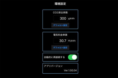 「CO2排出係数」は、環境省のホームページから「電気事業者別排出係数一覧」を参照して、筆者が契約しているオクトパスエナジーの0.0003トン/kWhというデータを確認。アプリに300g/kWhと入力しました。