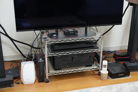 次に、自宅のシアタールームでたくさんのスピーカーを鳴らす家電でチェックします。テレビなどの映像機器と音響機器をつなぐ中心となるのが「AVアンプ(またはAVレシーバー)」という家電。映画館のように部屋のあちこちにあるスピーカーを鳴らせるものです。