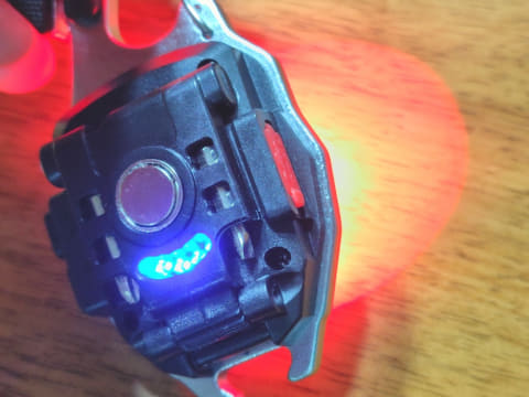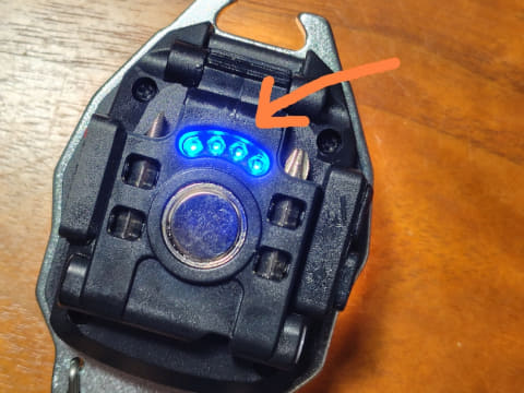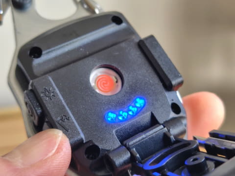 ライト点灯中は、着火機能使用時と同様に青い蓄電ランプも点灯します。内蔵バッテリーの残量によって蓄電ランプの点灯数が変わり(フル充電時は4つ点灯)、蓄電残量の目安がわかるのも便利だと思いました。