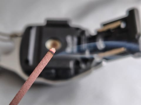 試しにお香に火をつけてみたところ、1回目では着火せず、3回目で火をつけることに成功。発熱時間が短いので、素材によっては1度では着火しづらいものもあるのではないかと思いました。付属の取扱説明書にも、焚き付けに着火する場合は、麻紐や細い枝を使用するようにとの記載があります。
