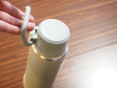 「JOY-750」には常に緑茶が入っているので、外出する時には、飲み物が熱すぎないかをチェックして、そのまま持っていくこともある。普段は使わないフタを締め、フタと一体化している大きめのキャリーループを持って外出する。