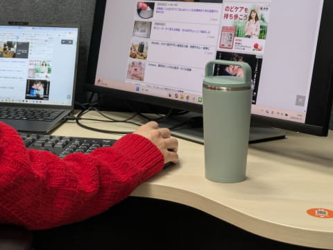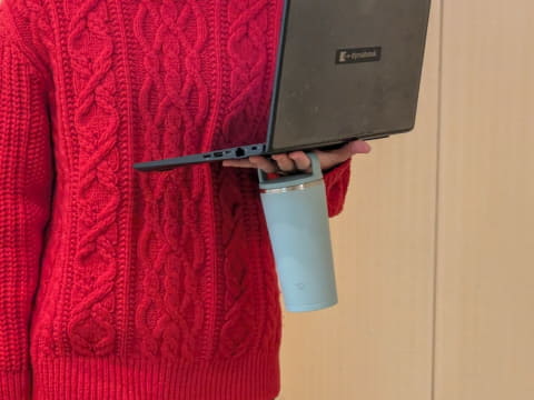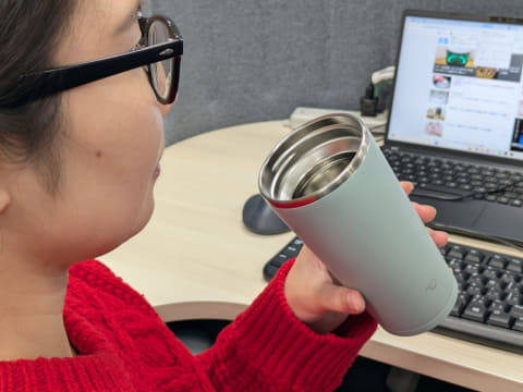 ポイントは、フタに取っ手が付いていること。打ち合わせや会議でオフィス内を移動する時に、取っ手があるのがとても便利! パソコンとタンブラーを片手で持てるため、扉を開けたり座席を動かしたりしやすいのだ。さらに、コップと違って水筒であることの利点は、フタが付いているため誤って倒してしまってもこぼれないことだという。確かにパソコンや書類を広げているデスクにお茶をこぼしてしまうと、大変なことになる。