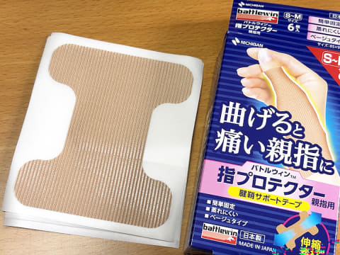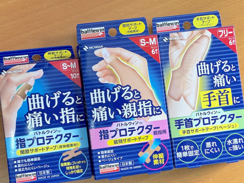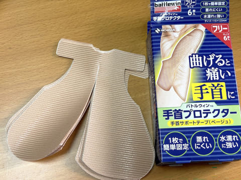 サポーターは大げさだし、テーピングも片手で貼るのは難しそうだなと思っていたところ、手首や指専用に開発されたテーピングテープの存在を知りました。セロテープでおなじみニチバンの「バトルウィン」シリーズで、手首と指、親指用の3タイプが用意されています。まずは、パソコンのパッド操作で負担が重い右手の手首に「手首プロテクター」を使ってみることにしました。