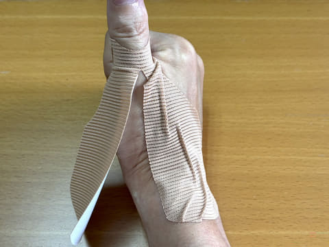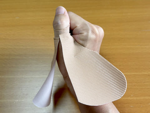 「バトルウィン」のプロテクター製品は、それぞれ独自の形状にカットされており、片手でも簡単に貼れることが特徴です。テーピングを施すと、手首まわりの可動域は狭まりますが、それが支えとなって手首の負担が軽減される感覚があります。手首を動かすとテーピングのテンションによってストレッチするときのような気持ちよさがあります。この引っ張られている感覚の分、筋肉がサポートされているのでしょう。