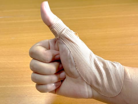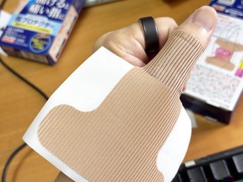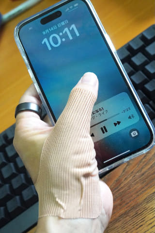 次に、スマホ操作で痛くなりがちな左手の親指に「指プロテクター親指用」を貼ってみました。手首用よりも、よりシンプルに親指の付け根部分と親指が固定され、スマホ使用時の痛みが軽減します。個人的には、普段あまり痛みを意識していませんでしたが、プロテクターをしない日は明らかに痛みが感じられ、効果があったのだと気づかされました。