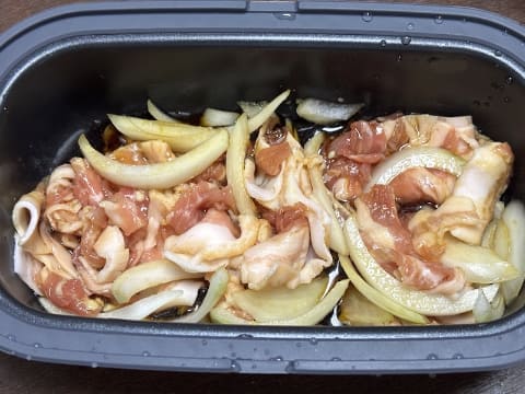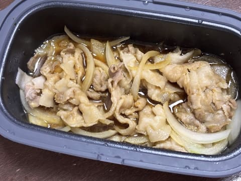 今回使用したのは、コメリのPB商品「Athena Life」シリーズ。まずは「ミニ深型」で、添付レシピにあった「豚の生姜焼き」を作ります。ちょうど中途半端に余っていた豚バラ肉に、薄切りにしたタマネギと調味料を加え、2回に分けて加熱するだけです。