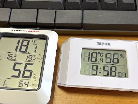 それまで自室で使っていた湿度計は、ThermoPro製。2019年10月に購入した記録があるので、まる6年経過したことになります。新しく買った湿度計と比べれば、どのぐらい狂っているかわかるぞと並べてみました。