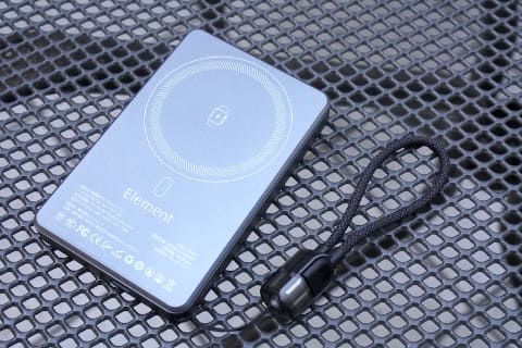 さて、マイファースト準固体電池モバイルバッテリーとしてお迎えしたのが、現在Makuakeで先行販売中のエレメント「Element Metal Power Bank 8000」です。容量は8,000mAhで、ワイヤレス充電(MagSafe)に対応、今どきのモバイルバッテリーらしく残量%を表示するディスプレイが搭載されています。重さは178gと、同容量のモバイルバッテリーに比べ、特段に重いわけではありません。最大出力は有線で18W、ワイヤレスで15Wです。