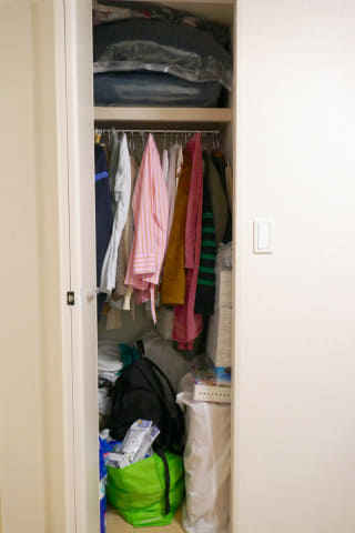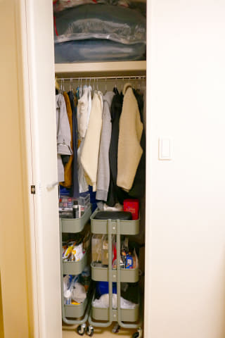 パンパンだったクローゼットは、中身を見直して不要なモノは処分し、洗剤などのストックは洗面所へ移動することでスペースが生まれました。そこへ、部屋に出ていたワゴンを入れ、使用頻度の少ない防災品や日用品を収めます。アウトドアグッズは玄関収納にも移動させました。