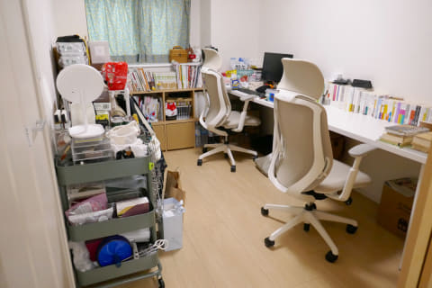 仕事部屋を拝見すると、机の上には資料や郵便物から、プロテインの袋やコスメグッズなど仕事に関係のないモノまで。壁際には「取っておきたい本」や説明書、資料などの紙ものと「飾っておきたいもの」が混在。机の背面や足元は、趣味のグッズや備蓄品置き場となっていました。