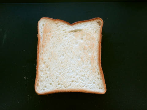 次に、冷凍しておいたパンを焼きました。こちらも同じ食パンモードでOKですが、時間を延ばします。常温の食パンを焼いたときに、ちょっと色が薄かったので、6分で設定しました(レシピでは4~6分)。表はムラなくこんがりと焼けていますが、裏側は少々白っぽい仕上がり。