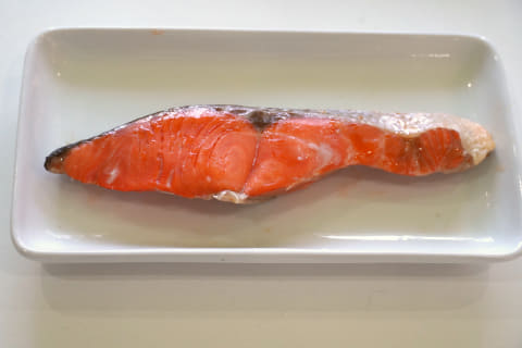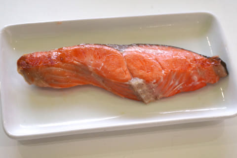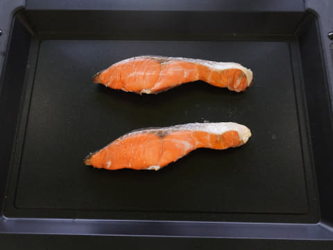 鮭は2切れをグリル(強)で焼きました。調理時間は14分(レシピでは13分30秒~14分30秒)。グリルプレートが加熱されるため、ひっくり返す必要はありません。