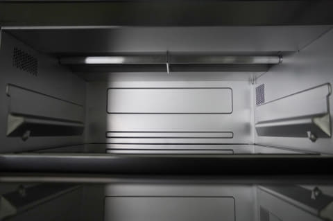扉を開けて驚いたのは、庫内が狭いこと。一見、そんな印象を受けたのですが、庫内サイズは349×279×132mm(幅×奥行き×高さ)で、実際には狭いというよりも庫内が低くなっています。スペックだけ見ると容量は15Lなので、1人用と思われそうですが、底の面積そのものは2~3人用の電子レンジとほぼ同じで、大きなお弁当も余裕で入るサイズです。