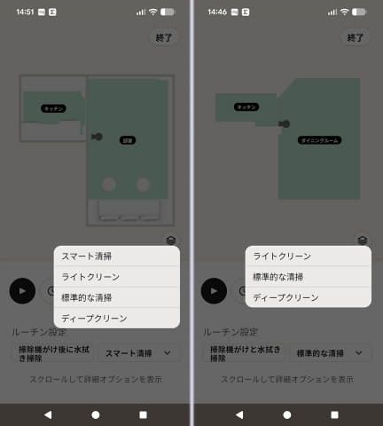 どちらも部屋の隅々までまわり、コーナーはしっかり掃除できます。12畳+6畳のスペースでは、705のスマート清掃で21分、105の標準的な清掃で19分でした。