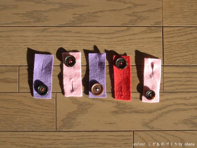とりあえずお試しで、短冊形を作ってみました。フェルトはほつれないので、端の処理は不要。切りっぱなしでOKです。カラフルだし、扱いやすいし、できたものはかわいいし、フェルト大好きです!新しくボタンを買うならもっとかわいい色を選びますが、ボタンの練習なんてほんの短い期間。家にあるもので工夫できた方がお得ですね。フェルトの土台も、魚の形にしたり、洋服の形にしたり、アイデアはいろいろあるけど、どの程度遊んでくれるか分からないので、まずは短冊形で。