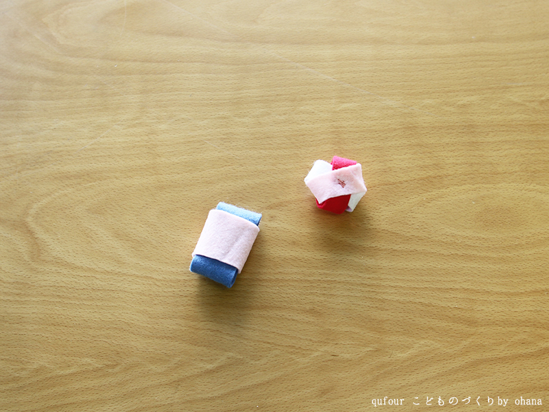 2種類の形で作ってみました。フェルトの長さは、中に入れるビー玉が転がる余裕ができるようにしてくださいね。余裕を取りすぎると、すき間からビー玉が落ちてしまいますで、ちょうどいい長さに調整しましょう。フェルトがやわらかく形を変えるので、指で押し出すような動きをすると、ビー玉が出てきます。小さな子どもの誤飲には特に注意してください。