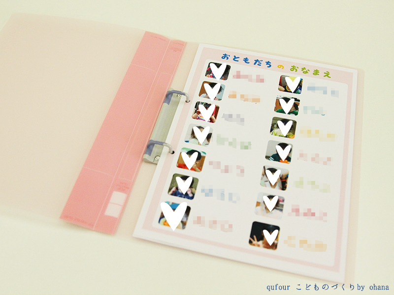 個人情報なのでほとんどお見せできませんが、私が作ったシートです。パソコンのイラスト制作ソフトを使って作りました。お友だちや先生を一覧にして、写真の横にひらがなで名前を書いてあります。「喜ぶかな?」と思い、娘の写真も入れてみたところ大喜びでした!おなまえシート用のファイルを用意してファイリングすれば、追加もできますし、絵本のように大切にしてくれています。