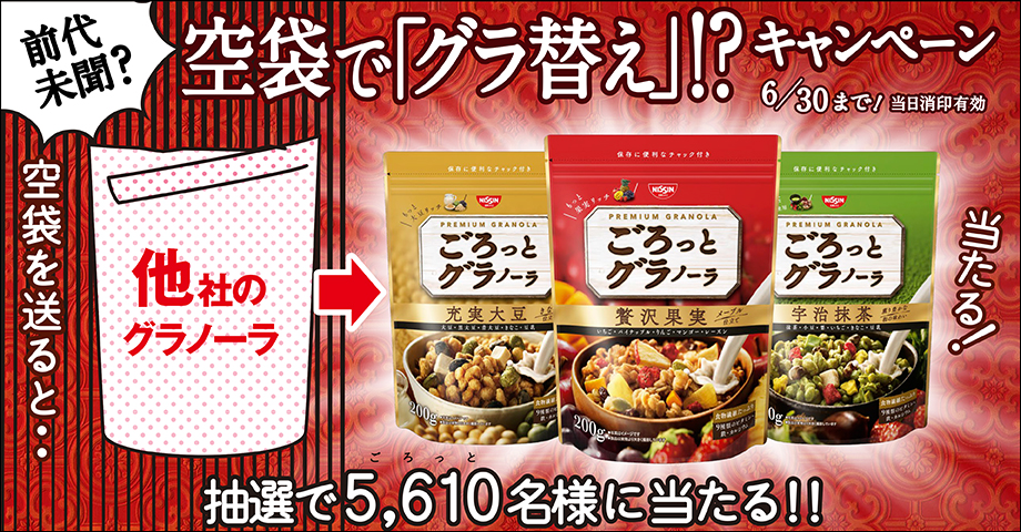 現在、日清シスコは新CMオンエアに合わせ、他社のグラノーラ商品の空袋(中身の入っていない袋のみ)を送ると、抽選で5,610(ごろっと)名に「ごろグラ」3品のセットが当たる「前代未聞?空袋で『グラ替え』!? キャンペーン」を実施しています。賞品は、メープル味の「贅沢果実」200g、きな粉風味の「充実大豆」200g、抹茶味の「宇治抹茶」200gの3個セットで、合計実勢価格は800円前後(※1)。他社製品を食べている人に「食べ比べてもらいたい!」というキャンペーン。6月30日の消印有効なので、応募はお早めに!