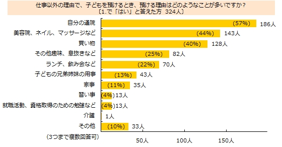 次に子どもを預けることがあると答えた324人へ「預ける理由はどのようなことが多いですか?」と尋ねたところ、半数を超えた回答は「自分の通院(57%)」だけでした。次いで「美容院、ネイル、マッサージなど(44%)」「買い物(40%)」「その他趣味、息抜きなど(25%)」「ランチ、飲み会など(22%)」と続きました。預けた理由のトップはやむをえない「通院」ですが、息抜きを兼ねた美容院や買い物などを挙げている人もいることが伺えます。