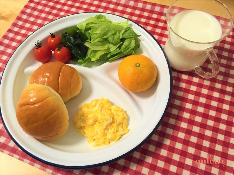 ロールパン2個または6枚切り食パン1枚(主食1つ)、サラダ70g程度(副菜1つ)、おかずに含まれるタンパク質が約6g(主菜1つ)、牛乳100ml(牛乳・乳製品1つ)、ミカン1個(果物1つ)