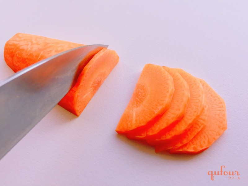 料理によって厚みを調節しますが、煮物料理では1~2cmほど、炒め物などの短時間で加熱するものやサラダなど生で食べる料理では数mmの厚さに切ります。