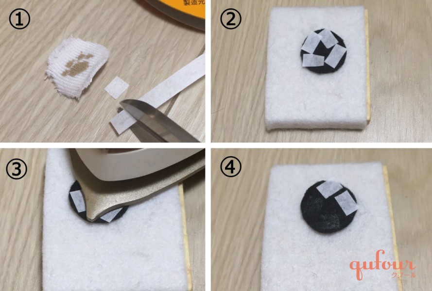 補修布の大きさに合わせて、布用両面接着テープを細かく切ります(写真1)。もう1枚の板の上へ、補修布を裏返して乗せ、さらに切った接着テープを乗せます(写真2、分かりやすいように補修布を黒い布にしています)。板をアイロン台にして、テープのはくり紙の上からアイロンを掛けます(写真3)。アイロンの温度やスチームの有無などは、テープの取扱説明書に従いましょう。熱が冷めたらテープのはくり紙をはがします。透明な接着テープが補修布に付いた状態です(写真4)